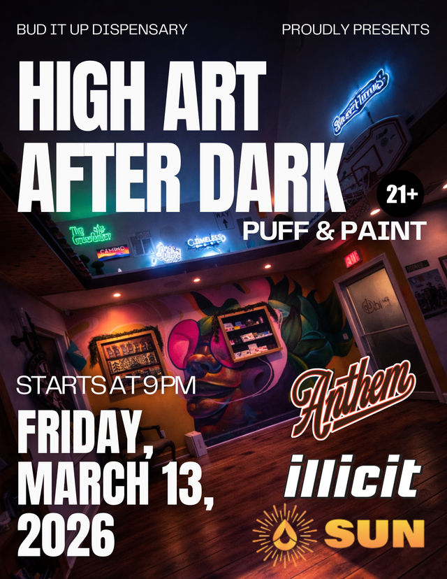 Join us at Bud It Up on Friday, March 13th from 9PM–Midnight for a late-night Puff & Paint experience sponsored by Anthem, Sun, and Illicit.